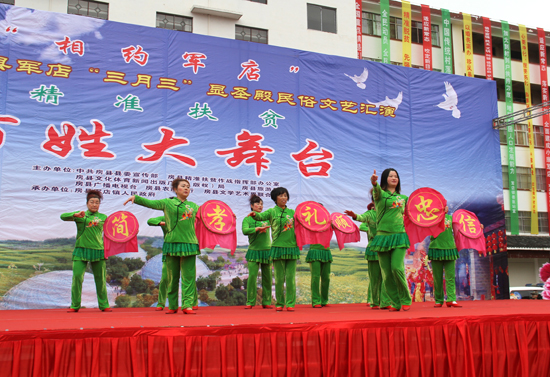 “姐妹们大家瞧,这‘信’字绣得好不好,做人就要讲信用,言行一致最重要,借人钱物按时还,言而有信人称道……”亿客隆超市的节目《房县十字价值观》,以刺绣情景剧的形式,唱出房县大力弘扬的“忠、孝、礼、义、信、简、俭、平、顺、和”的“十字”价值观。