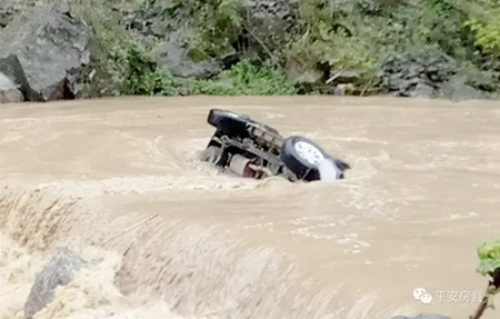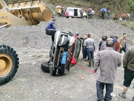 今日房县网讯 通讯员许世鹏 报道:受持续强降雨影响,9日,九道乡八里坡村,一辆接亲的婚车因路况不熟被河水冲翻4人被困。九道派出所长张立奎途经此地,迅速组织当地群众并调集正在附近施工的铲车进行救援。最终,将车辆和人员成功营救上岸。