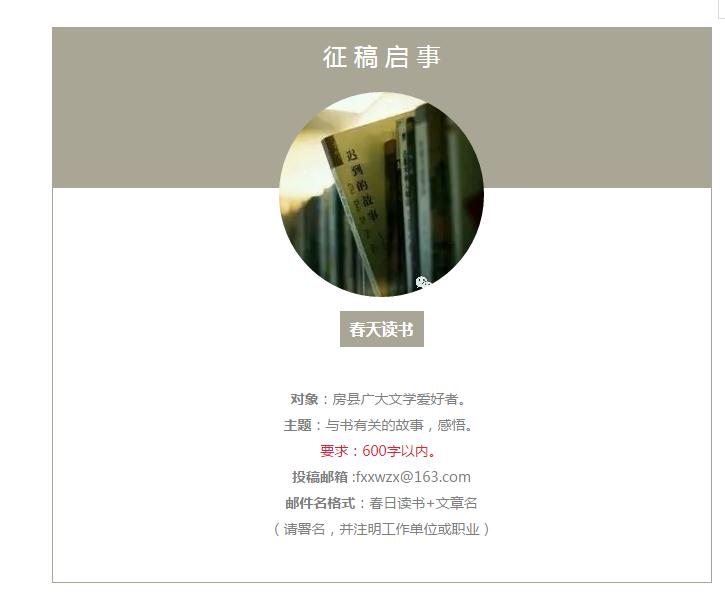 来稿经选用,将刊发在今日房县网、今日房县报、今日房县微信公众号“他们在春天读书”专栏,敬请关注。征文长期有效。