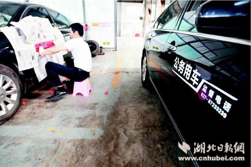 昨日,省直机关汽车修理中心,几辆公车正在喷涂“公务用车”标识和监督电话。 楚天都市报记者魏铼摄