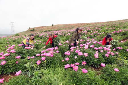 8日,军店镇三溪中村药材园的村民们正在芍药基地除草。2015年以来,军店镇以脱贫攻坚为主导,大力发展特色产业,共引进市场主体23家,成立种养殖专业合作社57个,目前已发展1万亩核桃基地、3万亩中药材基地、5000亩苗木花卉基地,打造生态观光农业示范元10000亩。通过产业发展,农民年均增收6000至8000元。(赵爱平 刘智宝 摄)