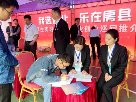 6日至7日,县人社局在湖北汽车工业学院、湖北工业职业技术学院、汉江师范学院、湖北医药学院4所高校开展“我选湖北·乐在房县”大学生实习实训岗位推介活动。据悉,此次活动共举行推荐会4场,为十堰4所高校大学生推介我县实习实训岗位670个,达成实习实训意向近600人(右图)。此次推介活动旨在着力提高引才质量,吸引更多大学生到房县就业创业。 (汪昌盛 摄)