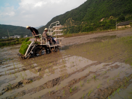 图为穿山堰村5月27日机械化插秧现场
