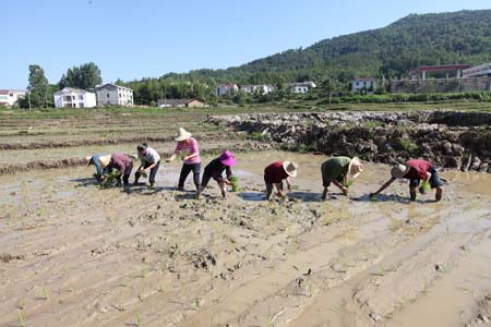 27日,土城镇穿山堰村三组的村民们正在合作社的秧田里栽植有机稻。今年,土城镇与庐陵王酒业有限公司签订有机稻谷种植收购协议,在土城镇白鸡、穿山、葛坪、塘埂4个村种植绿色无公害有机稻谷共计1200余亩,采用公司+基地+合作社+贫困户的模式进行种植。通过以上措施确保村集体经济收入和贫困户增收实现双赢,为村出列户脱贫奠定坚实基础。(赵爱平 吴勇星 蒙天禄 摄)