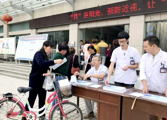 眼科主任杨祖杰率领4名医师在医院门诊广场免费为前来咨询问诊的市民义诊并发放宣教资料。近年来,该院通过开展近视防控健康教育、普及健康用眼科学知识、鼓励和倡导青少年经常参加户外体育活动等,协同推进青少年视力保护工作,增强健康用眼意识,形成良好的用眼习惯,降低青少年近视发生率,提高青少年视力健康水平。