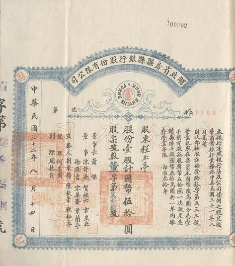 这是一张民国三十二年(1943年)八月十日发行的股票,由“湖北省房县县银行股份有限公司”发行,股东为程玉亭,董事长为萧杰。此外,股票还刊登有董事、监察人、经理、副经理等人员名单。