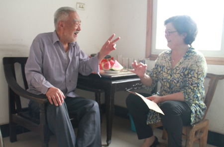 发须几乎全白的老人长着一对寿眉,近93岁高龄仍然行动麻利、思维清晰、笑口常开。