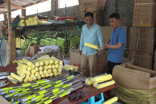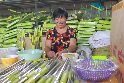 拖把杆的打孔、成品的组装,不需要什么技术,劳动强度小;以件计酬,工作时间相对自由。这让用工门槛大大降低。同等生产力下,宦熊优先雇用贫困户,让他们挣下这每月1500元至2500元的工资。