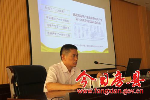 今日房县网讯 记者 高书文 报道: 7月29日,省第十一次党代会精神房县宣讲报告会在县政府第一办公区举行。市委宣讲团成员、市政府研究室副主任周哲兵做宣讲报告。县委书记、县人大常务委员会主任蔡贤忠主持报告会。