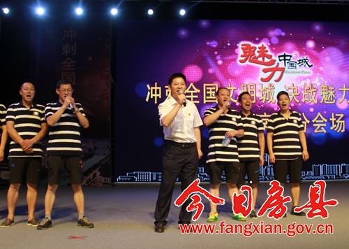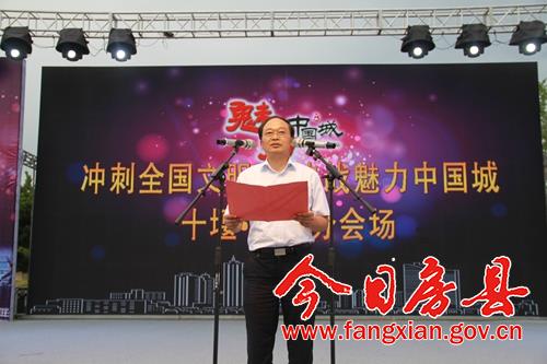 今日房县网讯 记者赵爱平 刘臣 报道:爱我家乡,挺我十堰,魅力中国城,十堰加油!8月11日,房县在诗经文化广场举行了“冲刺全国文明城·决战魅力中国城”网络投票电视网络直播活动,5000多市民现场为十堰竞演《魅力中国城》呐喊助威。县委书记蔡贤忠作动员讲话。县委副书记、县长纪道清现场拉票。王家波、高明哲、王宇星、祁国鹏、肖大有、陈刚、高勇、付必久等在家的县四大家领导出席活动。