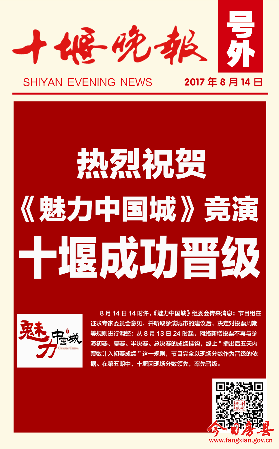秦楚网讯 记者何利 报道:今日13时30分,CCTV《魅力中国城》节目组委会发出正式通知,根据最新出台的活动规则,在第五期十堰市与茂名市的对决中,十堰因为现场竞演得分领先而成功晋级。