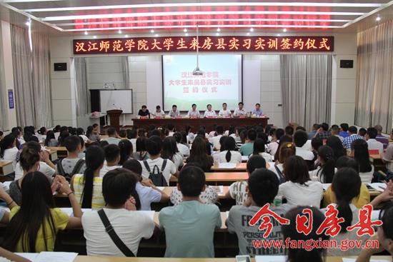 今日房县网讯 通讯员付培文 报道: 8月26日,汉江师范学院大学生来我县实习实训签约仪式在县实验小学举行。152名大学生与房县教育局签订实习实训协议并上岗实习。