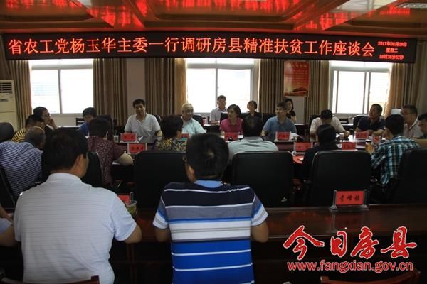 今日房县网讯 记者 陈锐 通讯员 何灵露 报道: 8月29日至30日,中国农工民主党湖北省委员会主任委员杨玉华一行来房调研精准扶贫工作。市政协副主席、农工党十堰市委主委朱云慧,县委副书记王家波,县委常委、统战部长、工会主席阮登香,县人大副主任李志权,副县长李弘弢陪同调研。
