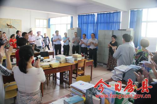 蔡贤忠一行走进房县一中教师集中办公区,与课间休息的教师们亲切握手,向他们致以教师节的问候,并祝愿学校教育教学工作再创新辉煌。他还向在场的教职工们介绍了房县一中迁建工作的进展情况以及新校区的选址过程、基础建筑的设计、办学理念,生动的描绘了未来师生们在新校区学习、生活的美好蓝图。