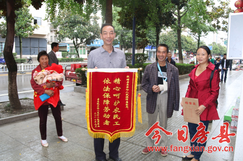 今日房县网讯 通讯员 陈立立 报道:9月25日,农民工周金业一家人手持印有“精心呵护农民工,依法保障劳动者”字样的锦旗,专程来到房县劳动保障监察局,亲手将锦旗赠送到劳动保障监察局副局长贺红光同志的手中,对办案人员赞不绝口,感激之情溢于言表。