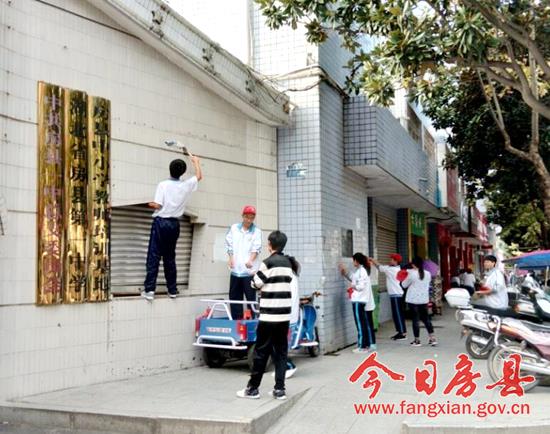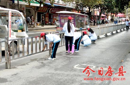 今日房县网讯 通讯员高英 报道: 9月28日下午5时许,在房县城关东城门路,一群头戴红帽、身着校服的年轻人正在紧张地忙碌着,他们有的在清扫垃圾,有的用抹布擦拭交通护栏,有的正费力地一点点清除墙壁上的野广告、顽固污渍等。他们是房县一中的青年志愿者,正在用切实的行动传递志愿精神,积极为创***贡献。