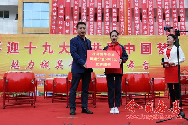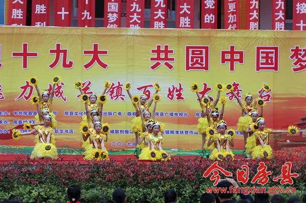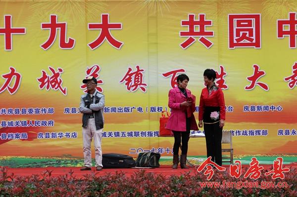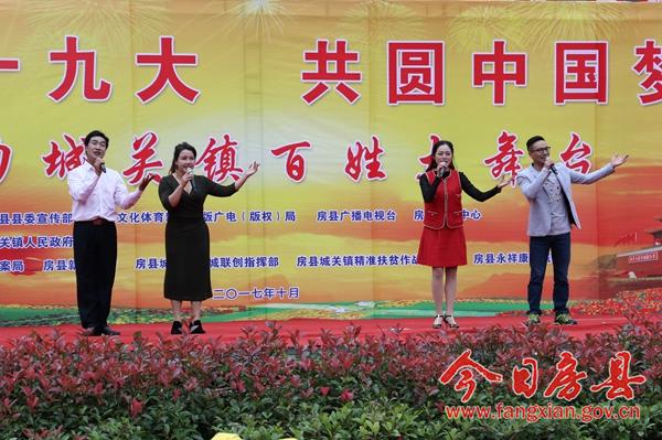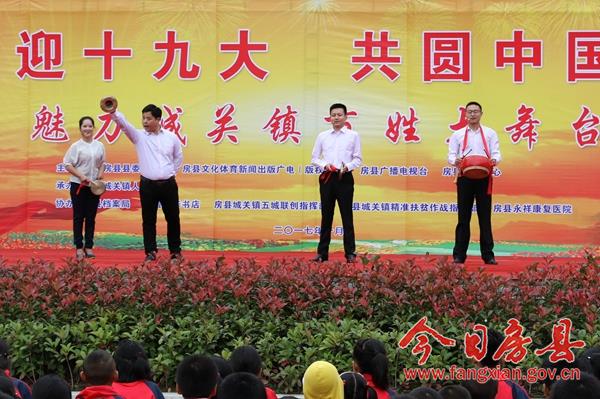 今日房县网讯 记者 赵爱平 陈锐 通讯员 柯勇 报道: 10月12日下午,由县委宣传部、县文广新局、县广播电视台、县新闻中心主办,城关镇人民政府承办,县档案局、县新华书店、城关镇五城联创指挥部、城关镇精准扶贫作战指挥部、永祥康复医院协办的,“喜迎十九大、共圆中国梦”魅力城关镇百姓大舞台活动在城关镇花宝小学成功举办。县委常委、宣传部长高勇,副县长冉瑶函,县政协副主席袁堂珍及活动主办、协办方负责人与当地千余群众和学生一道观赏了这一视听盛宴。
