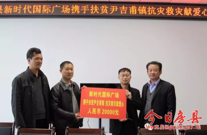 今日房县网讯 通讯员 蹇兴艳 报道: 19日,新时代国际广场开发商仁昌地产房县分公司总经理汪田将2万元救灾款送到尹吉甫镇相关负责人手中,用于沈家湾村灾害重建工作。