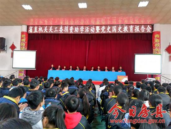 今日房县网讯 通讯员高英 报道: 为深入贯彻党的十九大精神和习近平总书记对关心下一代工作的重要指示,进一步加强党史国史及爱国主义教育,关心贫困山区青少年的健康成长,11月20日上午,省直机关关工委捐资助学活动暨党史国史教育报告会在房县一中举行。