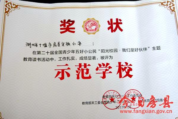 今日房县网讯 通讯员陆晓月 报道: 日前,教育部关工委通报表彰了一批第二十届全国青少年五好小公民“阳光少年.我们是好伙伴”主题教育活动优胜单位和个人。房县实验小学被教育部关工委评为“阳光少年.我们是好伙伴”主题教育活动“示范学校”,该校五(1)班廖堃、五(2)班徐振泽分获二等奖、三等奖。据了解,十堰市教育系统获此殊荣的单位仅有两家。