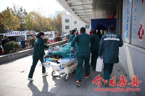 图为早已等候在现场的十堰市人民医院急救人员迅速将患者从直升机上转下,走绿色通道直奔心脏导管室