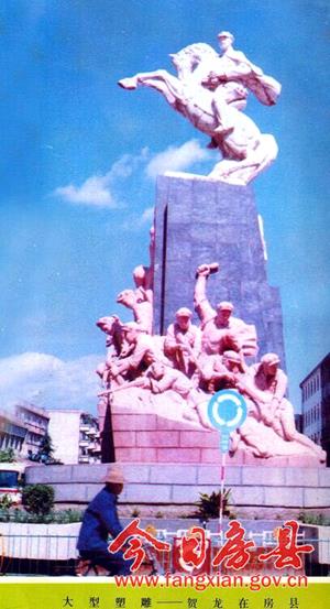 这是鄂西北第一座大型城市雕塑,高16米,宽13米,立于房县十字街中心,整十年。雕像中,贺龙横刀立马,旌旗飘扬,基座十八勇士视死如归,奋勇慷慨。