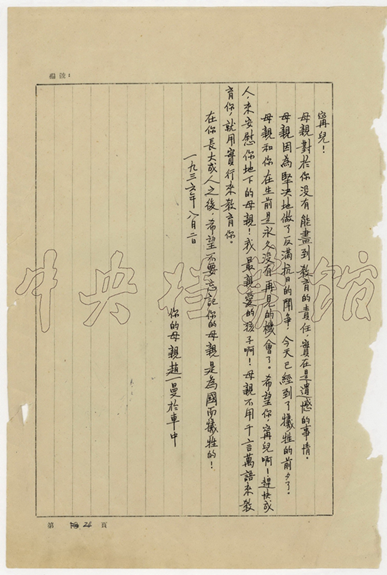 在你长大成人之后,希望你不要忘记你的母亲是为国而牺牲的!