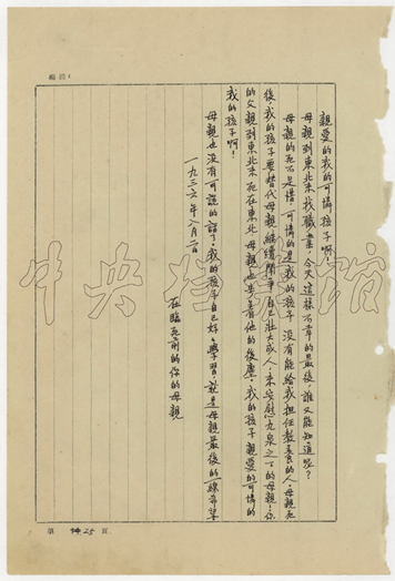 母亲的死不足惜,可怜的是我的孩子,没有能给我担任教育的人。母亲死后,我的孩子要代替母亲继续斗争,自己壮大成长,来安慰九泉之下的母亲!你的父亲到东北来死在东北,母亲也步着他的后尘。我的孩子,亲爱的可怜的我的孩子啊!
