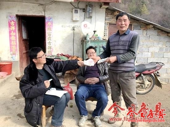 1月15日,野人谷镇马里村贫困户张忠华从县人民医院驻村工作队长裴中东手中接过刚刚出售8只山羊收入的7080元,高兴地说。