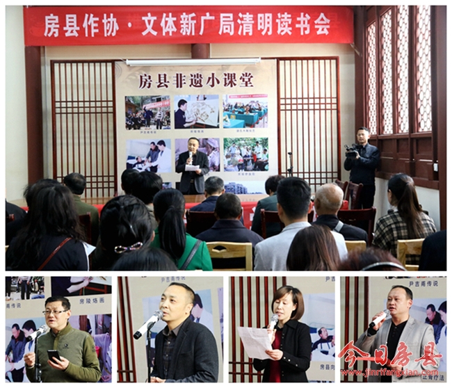 九旬高龄的县作协老会员任高、湖北省书法家会员何春元等多位文化界前辈应邀参加活动。在何春元的带领下,30余名参会人员一同向中国文化先贤孔子行礼。礼毕,读书会开始。作协会员和文体新广局干部职工踊跃参与,或朗诵国学经典,或诵读本土文学作品,或演唱诗经民歌,或表演乐器演奏,或赠送书法作品……用各自的方式表达对文化先贤的缅怀之情,对房陵文化的传承、弘扬和丰富。