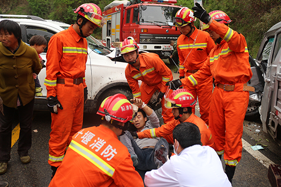 提前到达现场的医护人员对伤者进行了简单处理并为被困人员输液,等待消防官兵的救援。消防官兵到达现场后,发现路面满是碰撞留下的车体残片,一辆SUV小车停在路中间,小型货车司机腿部被紧紧卡住,情况危急,根据现场情况,指挥员立即组织官兵实施救援。第一组实施警戒,联合交警对现场路段进行临时管制;另一组利用牵引的方式扩大驾驶室空间,从而救出被困司机。经过消防官兵二十多分钟的努力,成功将被困人员救出并送往医院救治。