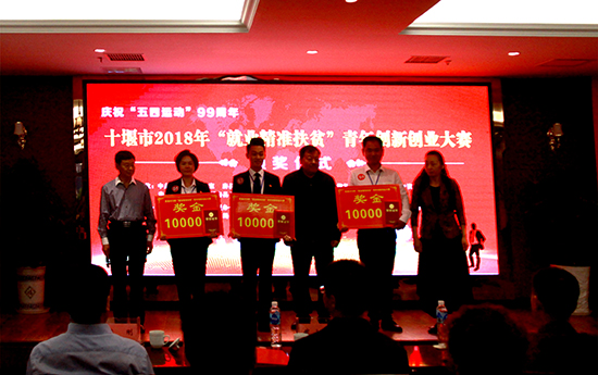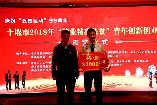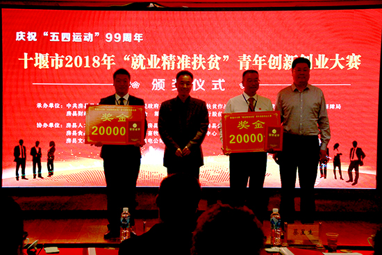 经预赛、决赛严格评选,角逐出2018年度房县“就业精准扶贫”青年创新创业大赛一、二、三等奖。房县千亿肉牛专业合作社选手陈余获得一等奖;房县高枧食用菌专业合作社选手唐义龙、房县军店神农北苑家庭农场选手杨小勇获得二等奖;十堰市誉贝电子商务有限公司选手宦熊、湖北房州土城黄酒有限公司选手杨洲、房县犇鑫育禽养殖专业合作社选手胡翠获得三等奖,分别获得奖金三万元、二万元、一万元创业扶贫扶持补助奖励。