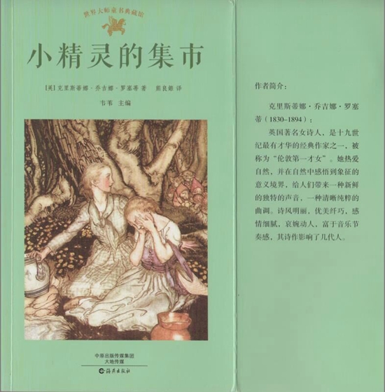《小精灵的集市》共选译了英国女诗人罗瑟蒂(1830年-1894年)的81首精美的儿童诗歌,几乎囊括了她所有的代表作。罗塞蒂被称为“伦敦第一才女”,从小热爱自然,雅好小诗,并以一种女性特有的多情善感,童心慧眼,在自然中感悟到象征的意义境界,给人们带来一种新鲜感,善于抓住孩子们的心理特点,描绘奇妙美丽的童话世界,让孩子们在感受生活和学习知识的同时,受到美的熏陶和人格的培育。她的诗风明丽晓畅,优美纤巧,音节和谐,感情细腻,富于音乐节奏感,很受读者喜爱,影响了几代人。