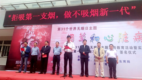 今日房县网讯 通讯员杨莉咏 报道: 今年5月31日是第31个世界无烟日。为教育和引导广大师生禁烟控烟,形成健康文明的生活方式,当天,由县人民政府主办、县卫计局和县教育局承办的第31个世界无烟日主题宣传教育活动暨“拒吸第一支烟,做不吸烟新一代”签名仪式在县实验中学举行。副县长李弘弢参加本次活动。