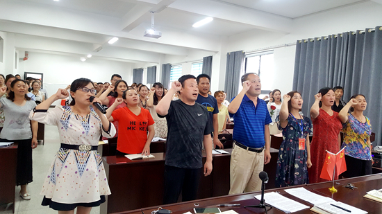 今日房县网讯 通讯员 吴吉娥 报道: “我是一名光荣的人民教师,肩负着教书育人的责任。我将严格遵守《中小学教师职业道德规范》,爱岗敬业,关爱学生,刻苦钻研,严谨笃学,勇于创新,奋发进取,淡泊名利,志存高远。争做一名师德高尚的教育工作者!宣誓人……”6月11日下午,在师德师风工作专题会上,房县天明小学全体教师就“师德师风”建设集体宣誓,郑重承诺。