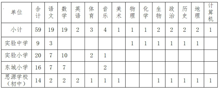 根据教师需求情况,结合我县教育系统实际,经研究决定采取公开招聘的形式,在全县在编在岗教师中公开招聘实验中学、实验小学、东城小学、思源学校教师。现将具体事宜公告如下: