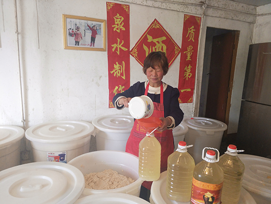 2018年春节期间,谭学云忙得不亦乐乎,每天都有游客慕名前来品尝、购买她酿制的黄酒。自己酿制的黄酒卖完后,她就帮邻居们销售黄酒。看着一壶壶黄酒被游客装车带走,她心里美滋滋的。