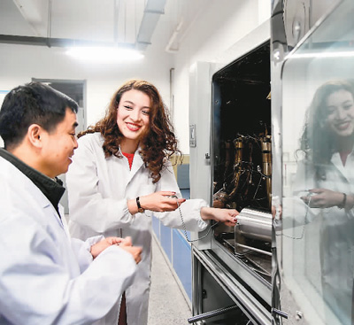 在中国石油大学(华东)石油工程学院,石油与天然气工程系张锐老师(左)在指导哈萨克斯坦留学生珍珠做页岩高温高压超低渗滤压力传递实验。 |