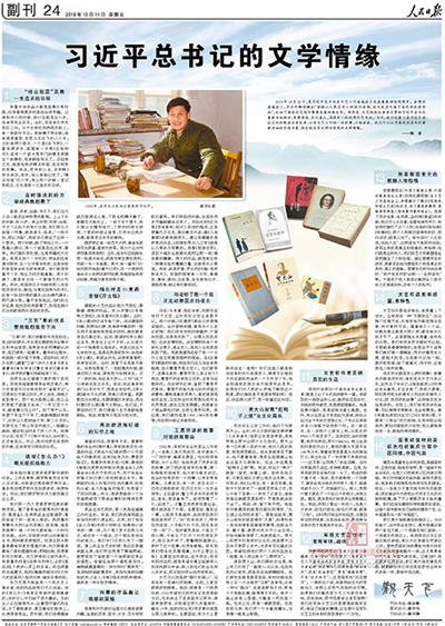 2016年10月14日,《人民日报》在第24版刊登了《习近平总书记的文学情缘》一文,文章的第一段就提到了“精忠报国”的故事。