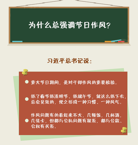 重大节日期间,是对干部作风的重要检验;中秋节、国庆节就要到了,要坚决刹住公款送节礼、公款吃喝、公款旅游和奢侈浪费等不正之风,过一个风清气正的中秋节、国庆节。
