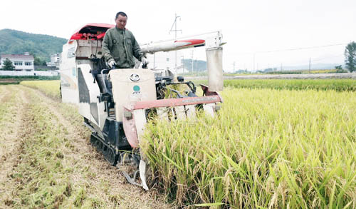 9月5日,记者在化龙堰镇李堰村看到,联合收割机在田间来回穿梭,吞下金黄色的稻杆,吐出一堆堆散发着清香的稻粒。全县12万亩水稻收割正式拉开序幕。