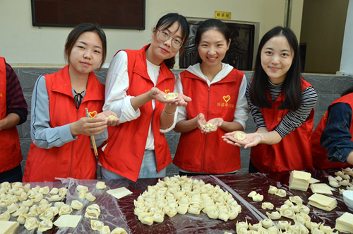 10点40分,开始包饺子了。志愿者把带来了新鲜肉馅进行调味,把面皮分发给各组,大家边包饺子边相互学习交流经验,相互切磋技术,比比看谁包得多、包得好,并创意把饺子摆成了大大“心”形,意在告诉大家要经常开展此类活动,让敬老爱老传统美德永远传承下去。