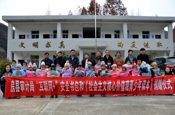 捐赠活动中,房县审计局长卢正斌为该校27名学生每人分发了爱心书包、图书、文具等学习用品,并亲自为孩子们戴上帽子、手套,该局退休职工赵东山同志将1万元现金捐赠给该校,用于改善办学条件。卢正斌希望同学们志存高远、好好学习、奋发向上,从小树立远大理想和抱负,把爱心和责任作为精神传承,不断提高自己、完善自己、发展自己,努力成为德、智、体、美全面发展的社会主义接班人。