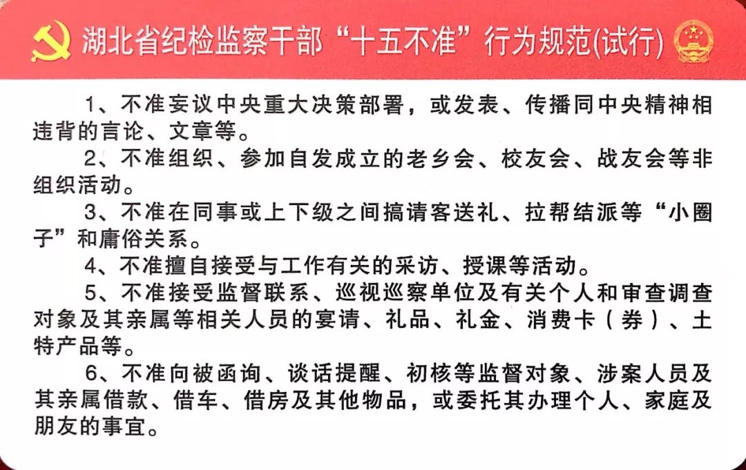 近日,湖北省纪委监委给全省近2万名纪检监察干部,发放了“十五不准”行为规范自律卡。哪些事儿,一定不能做?