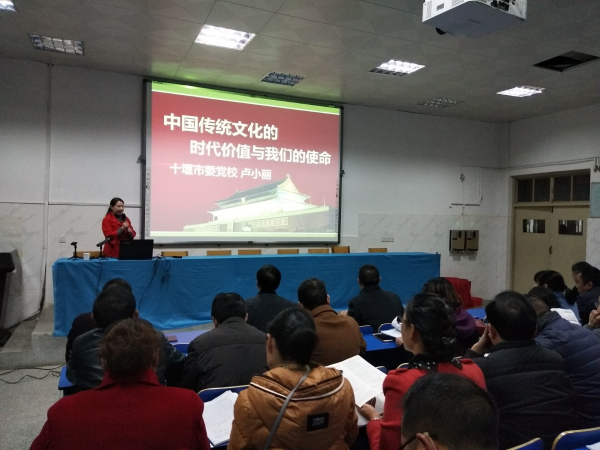 今日房县网讯 通讯员高英 报道:为了更好地弘扬中国传统文化,践行社会主义核心价值观,11月30日晚6时,房县一中特邀十堰市委党校讲师卢小丽以《中国传统文化的时代价值与我们的使命》为题做了一场精彩的讲座,为全体教师送上一顿丰盛的精神文化大餐。