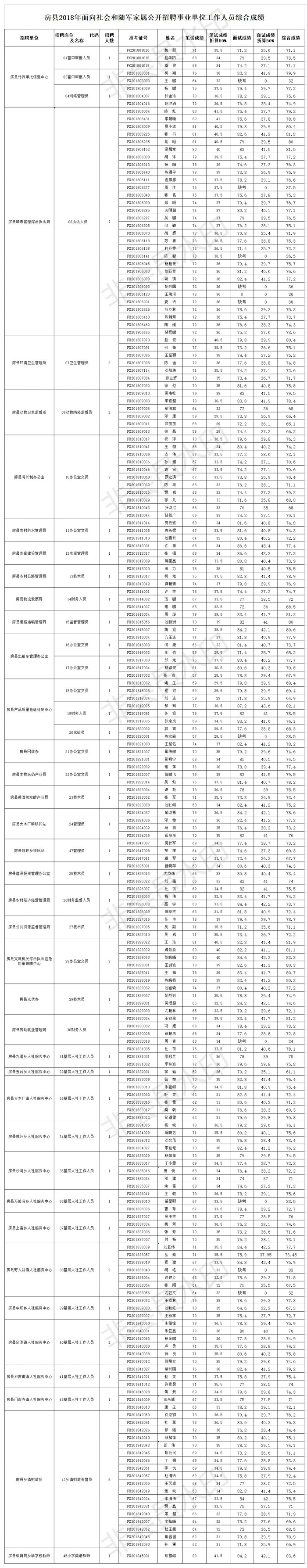 房县2018年面向社会和随军家属公开招聘事业单位工作人员笔试、面试工作已全面结束,根据《房县2018年面向社会和随军家属公开招聘事业单位工作人员公告》,现将笔试、面试及综合成绩予以公告。