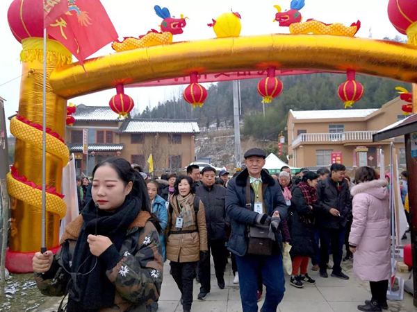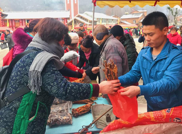 游客们共享年猪盛宴后,便来到年货展区采购年货。这里有传承千年的农家菜和地道的房县黄酒,是当地百姓“送祝礼”的必备佳品。“土味”十足的风味美食琳琅满目:炸卷卷、红薯粉、豆油精、土鸡蛋、烤玉米、烤红薯、魔芋、核桃,神农绿茶等等,让游客真正品尝到最地道的山珍美味,领略到最纯朴的乡土风情。