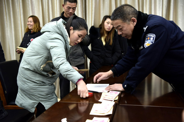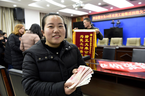12月19日上午,湖北省房县公安局为杨丽等14名农民工兑现了某公司拖欠他们5个月共84934元的工资。据了解,自2018年11月下旬以来,房县公安局治安部门与基层派出所合力开展整治拖欠农民工工资专项行动,民警深入企业全面调查摸排农民工工资发放情况,及时受理立案3起,共为农民工讨回欠薪20余万元。(魏世银 赵汗青 摄)
