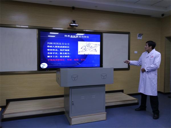 该院麻醉科主任胡荣清为学生授课,他利用生动直观的课件,教给学生正确有效地使用120急救电话的方法,介绍了除颤仪的操作要领,重点讲解了心肺复苏的概念、目的和意义,心肺复苏的适应症以及什么情况不能做心肺复苏等知识。教给学生判断方法、现场施救的操作程序、操作方法及注意事项,告知学生心肺复苏的有效标志、转移病人应注意的问题、心肺复苏终止指征等。讲解过程中与学生进行互动,帮助学生切实掌握正确的救护技能。