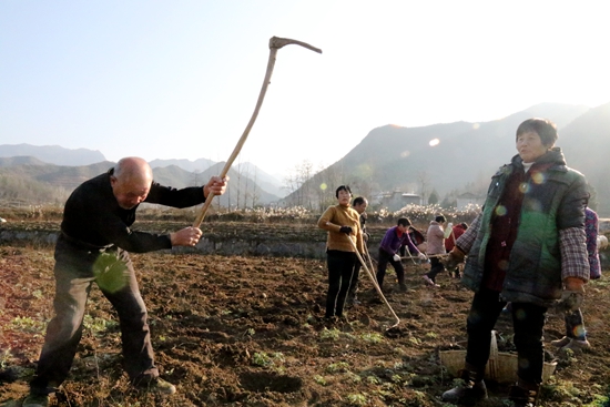 孙志祥(左)和村民们在基地务工,种植虎杖